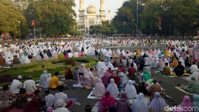 Ribuan jemaah mengikuti salat Idul Adha 2022 di Masjid Agung Jami Malang. Sakjing banyaknya, jemaah meluber hingga ke jalan dan Alun-Alun Merdeka Kota Malang.