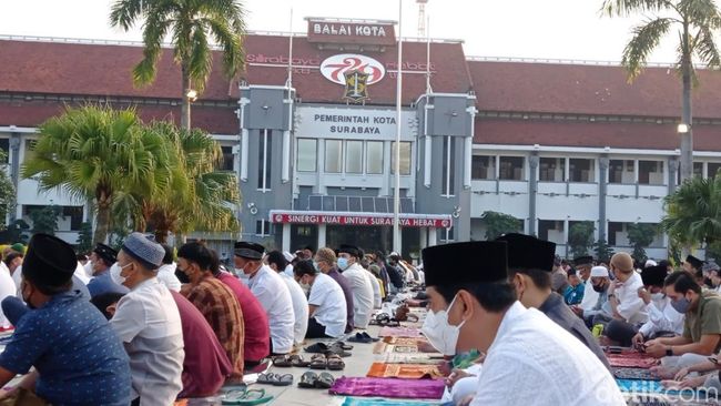 Setelah dua tahun vakum karena pandemi COVID-19, warga Surabaya tahun ini bisa kembali salat Idul Adha di Taman Surya Balai Kota. Taman Surya Balai Kota pun dipenuhi oleh warga Surabaya.