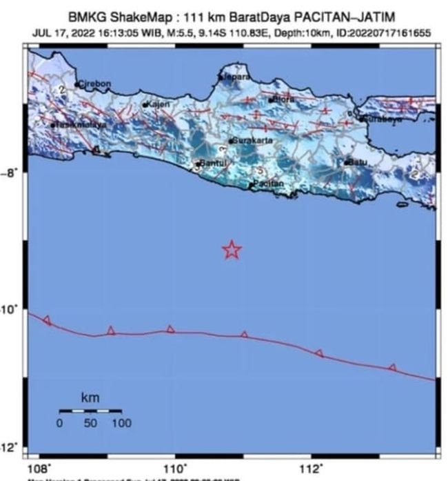 Sebelumnya, gempa M 5,5 terjadi di Kabupaten Pacitan, Jawa Timur, terjadi pada Minggu (17/7/2022) pukul 16:13:05 WIB. Gempa memiliki kedalaman 10 Km. Titik koordinat gempa berada di 9.14 Lintang Selatan (LS) dan 110.83 Bujur Timur (BT).