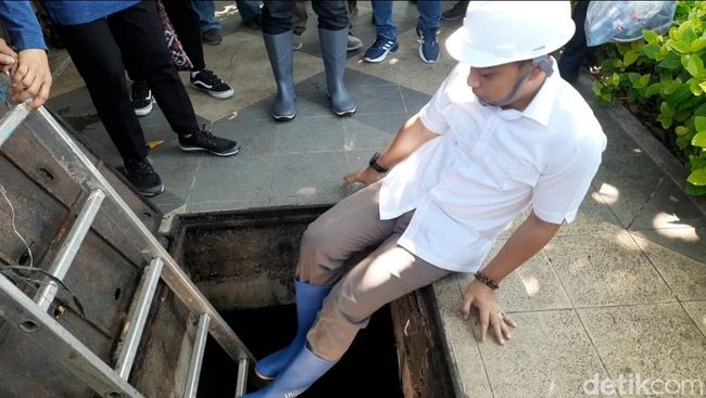 Ia tampak mengenakan sepatu boots air dan memakai helm proyek, beserta lampu di kepala untuk turun ke gorong-gorong. Dia tidak mengganti pakaiannya, kemeja warna putih yang biasa ia pakai.