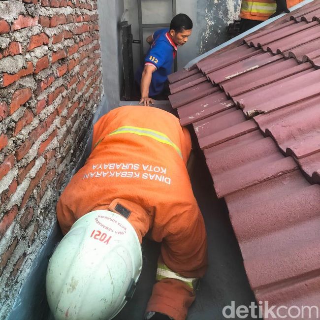 Petugas damkar dan penyelamatan Kota Surabaya menyelamatkan anak kucing terjebak di pipa saluran air. Penyelamatan ini berawal dari kucing yang melahirkan di atap rumah warga.