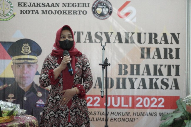 Memperingati Hari Bhakti Adhyaksa (HBA) ke-62, Wali Kota Mojokerto Ika Puspitasari bersama seluruh Kepala Organisasi Perangkat Daerah (OPD) menghadiri tasyakuran yang digelar Kejaksaan Negeri (Kejari) Kota Mojokerto, Jumat (22/7). Dalam kesempatan ini Ning Ita, sapaan akrab Ika, berharap sinergitas dan kolaborasi yang selama ini telah terjalin antara Pemerintah Kota (Pemkot) dengan Kejari Kota Mojokerto dapat terus dipertahankan.