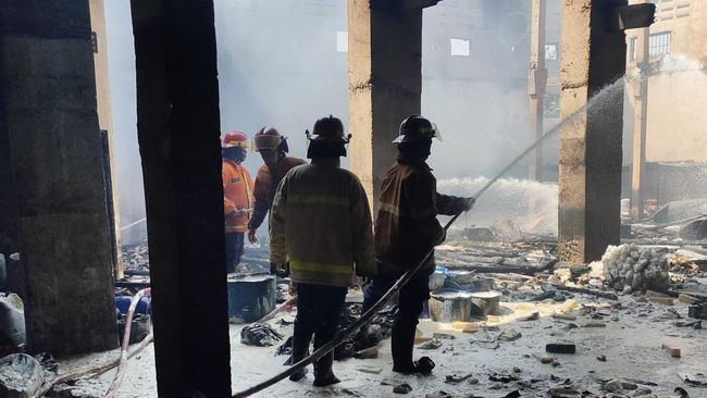 Kebakaran terjadi di gudang penyimpanan bahan kimia milik CV Nuranech Jaya Gemilang di Jalan Raya Trosobo No 8, Taman, Sidoarjo. Petugas PMK sempat kesulitan memadamkan api lantaran terkendala bau menyengat yang diduga dari bahan kimia.