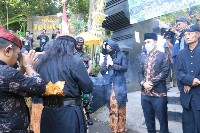 Bupati Mojokerto Ikfina Fahmawati menghadiri ruwat agung Petirtaan Jolotundo di Dusun Biting, Desa Seloliman, Kecamatan Trawas. Prosesi di situs purbakala peninggalan Kerajaan Medang Kamulan sampai Majapahit ini dilakukan untuk melestarikan warisan para leluhur sekaligus mata air yang menjadi sumber kehidupan.