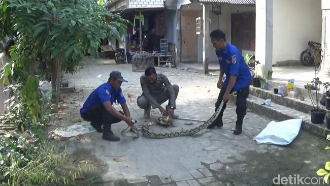 Tidak sendirian, Piton yang membuat resah warga desa setempat itu ditemukan bersama puluhan telurnya yang bersarang di kandang tersebut.