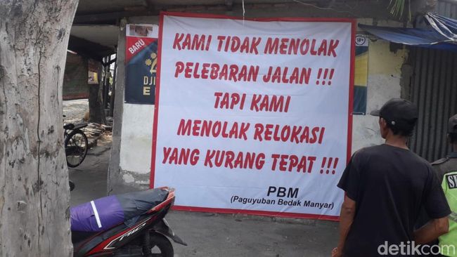 Meski tidak menolak proyek pelebaran Jalan Raya Manyar, Manyarejo, Gresik para pedagang yang menggantungkan hidup pada stan yang mereka miliki menolak untuk direlokasi. Sebagai bentuk penolakan, para pedagang memasang spanduk penolakan di depan stan masing-masing.