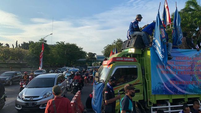 Pantauan detikJatim pukul 15.00 WIB, sekitar 1.000 massa FSP RTMM SPSI Jatim mulai memadati depan Kantor Gubernur Jatim. Massa membawa sejumlah tuntutan.
