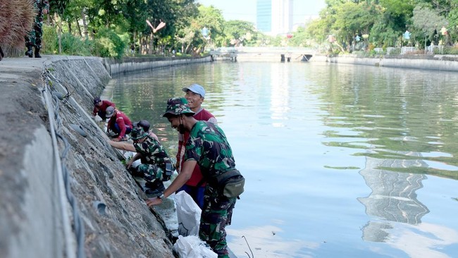 Memperingati Kemerdekaan tak selalu dengan perlombaan. Seperti yang dilakukan Pemkot Surabaya bersama TNI AL saat kerja bakti membersihkan sepanjang Sungai Kalimas.