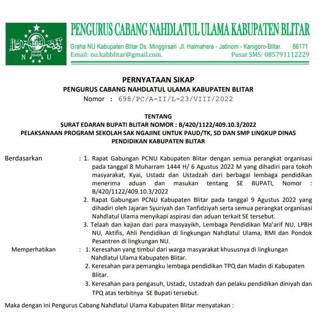 Berikut empat poin yang ada dalam surat pernyataan sikap PCNU Kabupaten Blitar:
