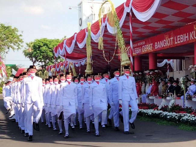 Pemerintah Kota Surabaya menggelar upacara HUT ke-77 RI di halaman Balai Kota Surabaya hari ini, Rabu (17/8/2022). Wali Kota Surabaya Eri Cahyadi berencana kunjungi veteran setelah upacara. Eri berjanji akan selalu memperhatikan para veteran karena telah berjasa membawa kemerdekaan bagi Indonesia.