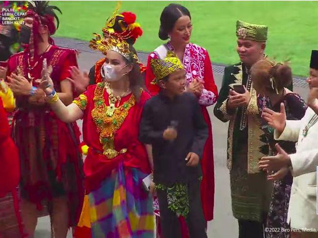 Dilihat detikHot dari akun YouTube Sekretariat Presiden, Rabu (17/8/2022), Farel Prayoga mengisi segmen persembahan lagu-lagu dengan membawa lagu 'Ojo Dibandingke'. Farel mengenakan baju hitam lengkap dengan udeng khas Banyuwangi berwarna kuning.