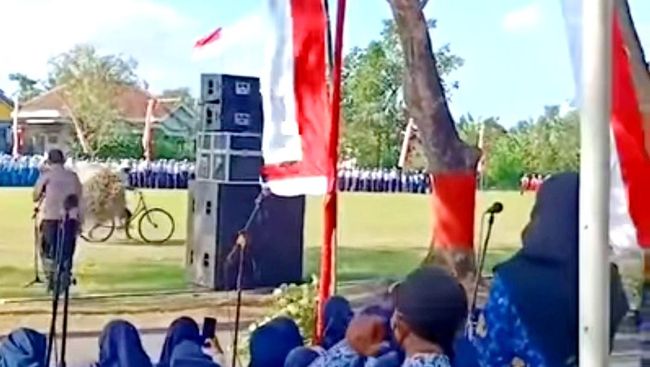 Sebuah video seorang warga membawa setumpuk jerami untuk pakan ternak viral di media sosial. Warga yang membawa tumpukan jerami itu melintasi lapangan yang sedang berlangsung upacara bendera.