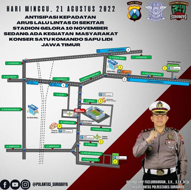 Arif mengatakan diperkirakan terjadi kepadatan arus lalu lintas di sekitar Gelora 10 November Tambaksari karena dihadiri ribuan orang. Karena itu Arif mengimbau kepada pengguna jalan tidak melintas di jalan depan Stadion.