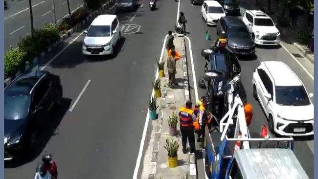 "Mobil melaju dari arah timur ke barat berada di lajur kiri arah bunderan satelit, namun tepat di depan makam pahlawan, kaget melihat motor yang tiba-tiba memotong lajur mobil. Seketika, mobil langsung membanting setir ke kanan dan menabrak trotoar hingga terbalik," ujarnya.