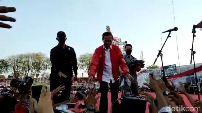 Dari pantauan detikJatim, Jokowi masuk dan naik ke panggung sekitar pukul 15.40 WIB. Jokowi mengenakan jaket bomber warna merah dan putih serta didampingi istrinya, Iriana Jokowi.