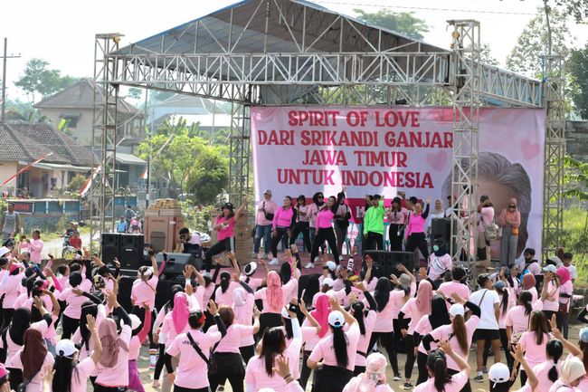 Relawan perempuan pendukung Ganjar Pranowo yang tergabung dalam Srikandi Ganjar Jawa Timur menggelar acara 'Spirit of Love' di Kabupaten Malang. Kegiatan yang berisi sejumlah aktivitas olahraga ini disertai dukungan atas aspirasi 'Ganjar Presiden 2024'.