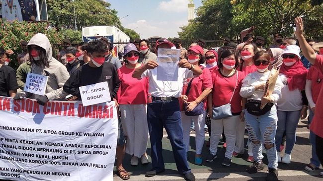 Puluhan korban proyek apartemen Sipoa Grup mengatasnamakan Paguyuban SIOK Cinta Damai menggelar aksi di depan Polda Jatim. Meski sudah diambil alih Mabes Polri, mereka menuntut kasusnya kembali ditangani di Polda Jatim.