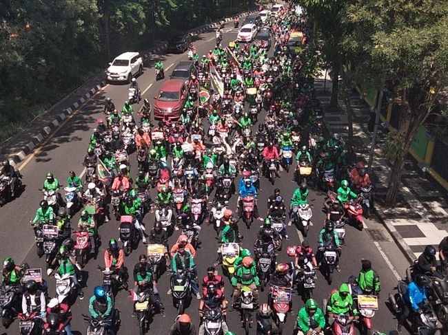 Massa driver ojek online (ojol) melakukan aksi di beberapa titik melanjutkan perjalanan ke pusat kota. Sebelumnya, mereka juga akan mendatangi beberapa kantor aplikator.