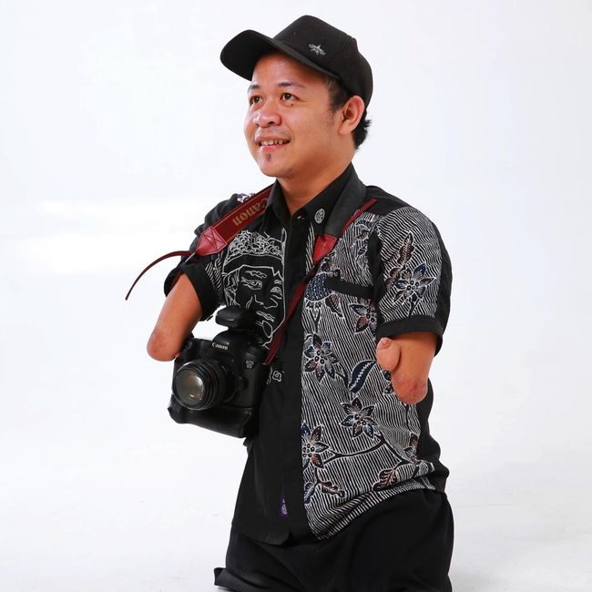 Untuk menekan tombol on dan off ia menggunakan bibir, sedangkan bagian bawah tangannya yang kecil menekan shutter. Tak hanya pandai menggunakan kamera, mahasiswa jurusan Hukum di salah satu universitas di Banyuwangi ini juga bisa bermain piano.