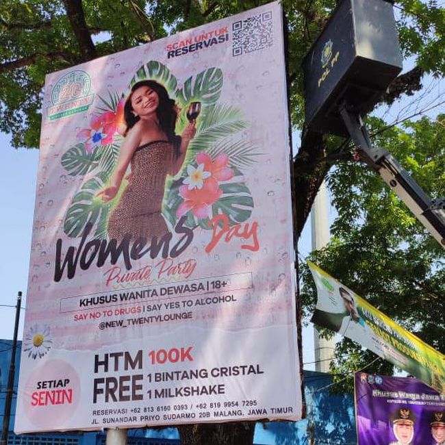 Reklame ajakan itu bergambar seorang wanita berpakaian ketat memegang gelas di tangan kiri dengan senyum. Sebuah tulisan tepat di bagian bawah gambar bertuliskan 'Women Day Private' atau pesta pribadi hari perempuan.