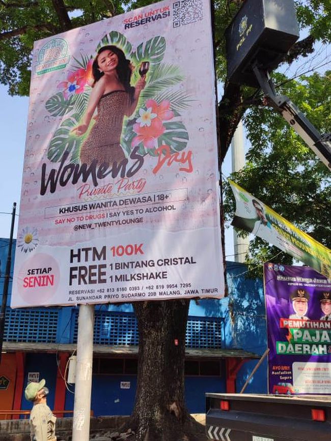 Reklame itu memuat tulisan 'Women Day Private' atau pesta pribadi hari perempuan.Terpampang seorang perempuan mengenakan pakaian seksi dan memegang sebuah gelas di tangan kirinya.