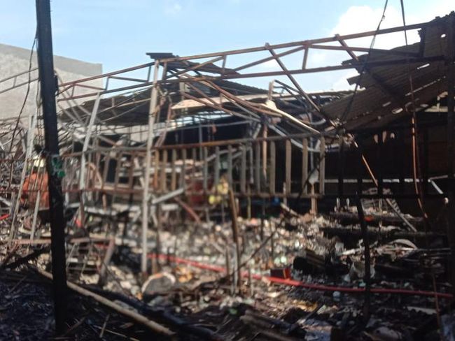 Kebakaran terjadi di Jalan Pondok Benowo Indah, Pakal, Surabaya Sabtu (27/8/2022) siang. Kebakaran itu menyebabkan 3 stan pedagang dan 1 unit sepeda motor ludes dilahap si Jago Merah.