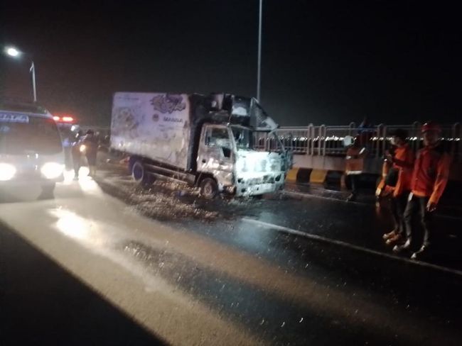 Sebuah kendaraan boks pengangkut roti terbakar di tengah Jembatan Suramadu, Sabtu malam (27/8/2022). Kebakaran diduga karena korsleting listik dari mesin mobil.