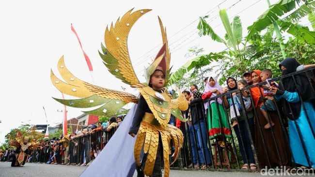 "Kostum yang saya pakai bertema Damarwulan. Semuanya dari bambu, sementara sayap dan mahkota terbuat dari daunnya," ujar Raka kepada wartawan.