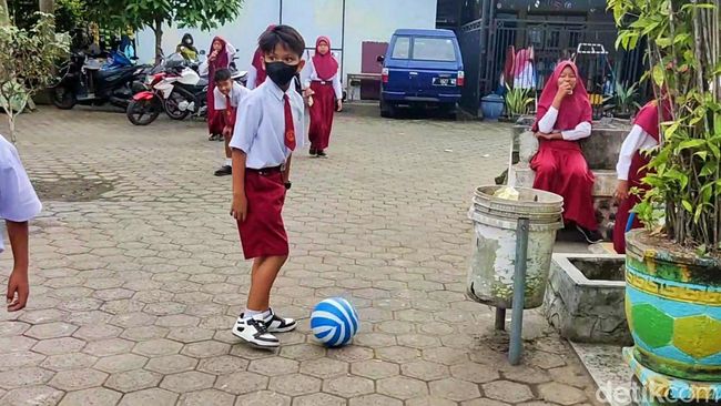 Farel bermain bola saat waktu istirahat jam pelajaran, di lapangan SDN 2 Kepundungan, Kecamatan Srono Banyuwangi, Senin (29/8/2022).