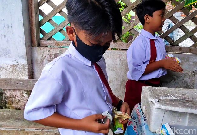 Pantauan detikJatim, Farel jajan di kantin sekolah SDN 2 Kepundungan, Kecamatan Srono, Banyuwangi, Senin (29/8/2022). Dia membeli minuman bersama dengan temannya.