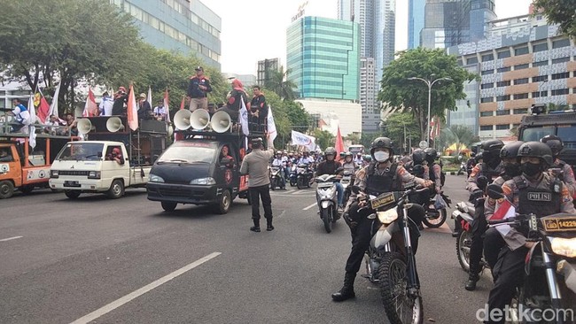 Pantauan detikJatim, di lokasi, massa membawa sejumlah atribut bendera dan spanduk. Terlihat beberapa di antara bendera yang dibawa bertuliskan Partai Buruh, FSPMI, juga SPPJM.