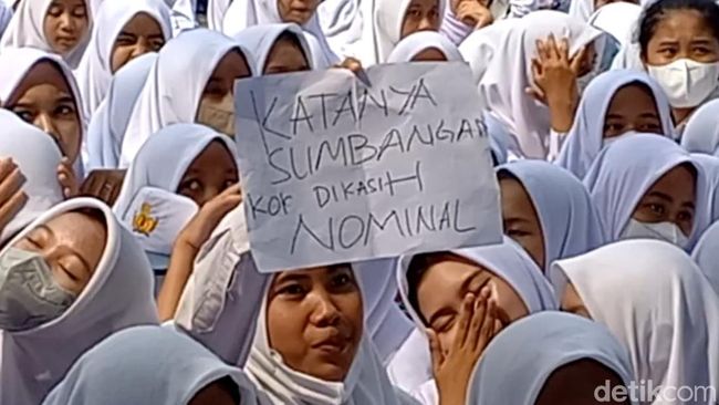 "Sumbangan or santunan, katanya sumbangan kok dikasih nominal, PPP infonya parkir 2 lantai," demikian tulisan dalam poster yang dibentangkan siswa.