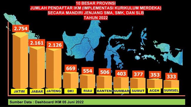 Alhasil, berdasarkan data yang diperoleh dari dashboard IKM pada 5 Juni 2022, Jatim menjadi pelaksana IKM jalur Mandiri terbanyak se Indonesia dengan jumlah kepesertaan pada SLB, SMA dan SMK mencapai 2.754 lembaga. Dengan rincian SMA 1.047 lembaga, SMK 1.474 lembaga dan SLB 233 lembaga.