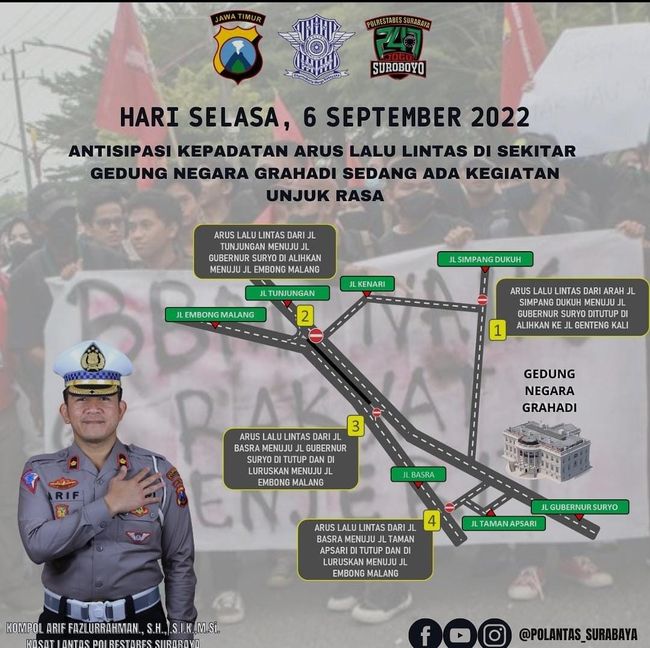 Sementara pengalihan arus yang menuju ke Grahadi atau di Jalan Gubernur Suryo Surabaya juga dilakukan. Kendaraan dari Jalan Gemblongan akan diarahkan ke Jalan Genteng Kali. Lalu, arus kendaraan dari Jalan Tunjungan akan diarahkan ke Jalan Embong Malang. Sedangkan arus lalu lintas dari Jalan Basuki Rahmat akan dialihkan menuju Embong Malang.