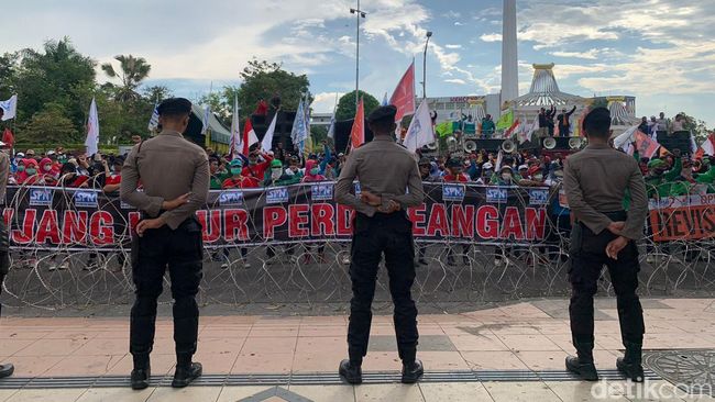 Pantauan detikJatim pukul 14.30 WIB, ratusan buruh mulai berdatangan di depan kantor Gubernur Jatim. Para buruh datang membawa berbagai poster dan 4 mobil komando.