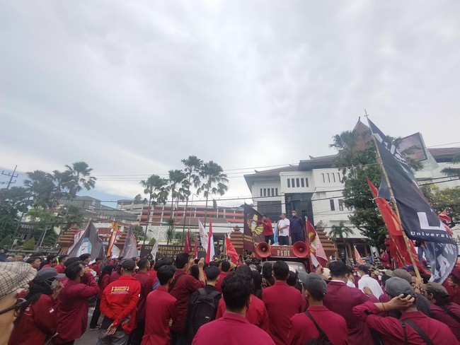 "Kami tegas menolak kenaikan BBM. BBM terbukti menyengsarakan rakyat," teriak salah satu mahasiswa di atas mobil komando, Selasa (6/9/2022).