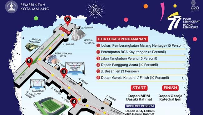 "Start dari Kayutangan dan finisnya Gereja Ijen," kata Nur Widianto saat dikonfirmasi detikJatim, Sabtu (10/9/2022).