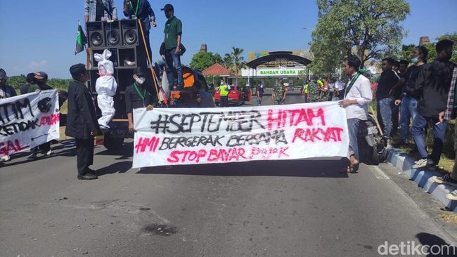Berdasarkan pantauan detikJatim di lokasi, ada kurang lebih 100 mahasiswa yang memblokade jalan menuju Terminal 1 (T1) Bandara Internasional Juanda.