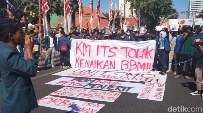 Ratusan mahasiswa dari sejumlah kampus di Surabaya kembali melakukan aksi unjuk rasa. Mereka melakukan long march sembari membentangkan spanduk bertuliskan tagar tolakkenaikanbbm.