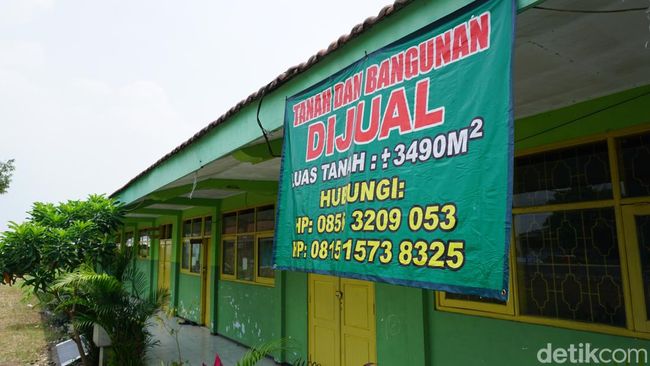 Banner bertuliskan 'Tanah dan Bangunan Dijual Luas Tanah 3.490 meter persegi' lengkap dengan nomor ponsel penjual dipasang di depan ruangan kepala sekolah sejak sekitar 2 pekan lalu.