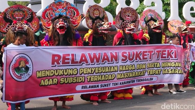 Puluhan pemuda mengatasnamakan diri Relawan Suket Teki Kabupaten Trenggalek menggelar unjuk rasa mendukung kebijakan pemerintah menaikkan harga BBM. Dalam aksi itu mereka berorasi dan menggelar pertunjukan tari barong dan jaranan.