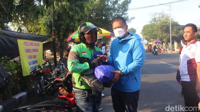 "Pak berikut paket sembako dari kami, semoga bermanfaat dan ketika berkendara di jalan raya jangan lupa mematuhi peraturan lalu lintas ya," kata Kusumo saat memberikan paket sembako ke pengendara ojek online di depan Masjid Agung, Minggu (18/9/2022).