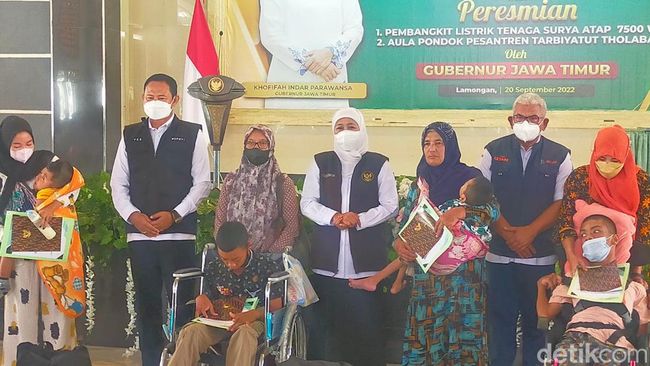 Usai mengunjungi Pasar Ikan Lamongan, Gubernur Jatim Khofifah Indar Parawansa melanjutkan acaranya di Ponpes Tarbiyatut Tholabah, Paciran. Di tempat ini, Khofifah memberikan bantuan sosial masyarakat hingga meresmikan pembangkit listrik tenaga surya (PLTS).