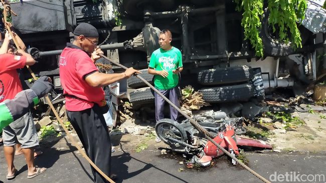 Sebelum terguling, truk tangki bernopol AA 1795 DE diduga memuat solar itu juga menabrak sebuah warung. Pemilik warung bernama Yayuk itu, kata Eko, diduga juga terjepit.