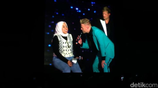 Namun selain terpukau, ribuan penonton juga sempat dibuat iri. Pasalnya di pertengahan konser, Westlife membuat kejutan dengan meminta seorang penonton untuk naik ke atas panggung.