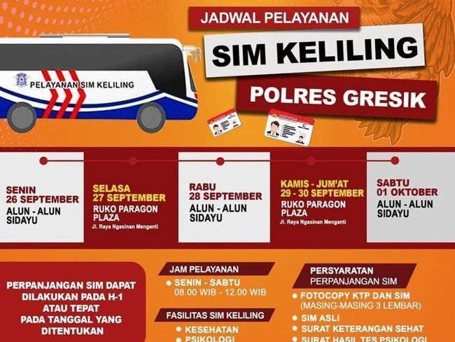 Rabu 27 September 2022 ini, Mobil SIM Keliling Gresik bakal mangkal di Ruko Paragon Plaza di Jalan Raya Ngasinan, Menganti.