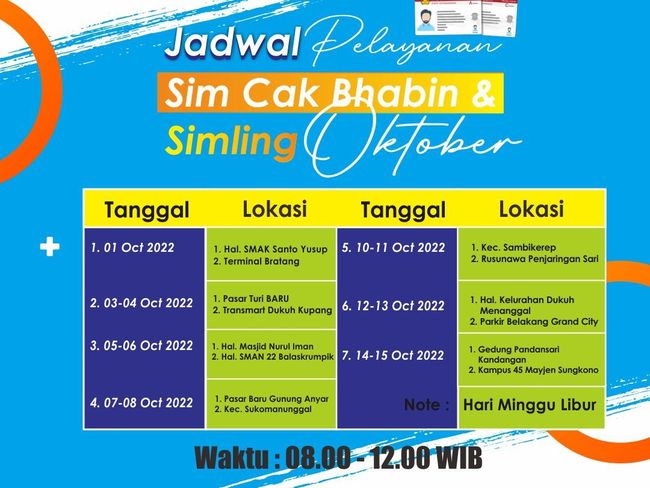 Mobil SIM keliling hanya akan melayani perpanjangan SIM A maupun SIM C dari pukul 08.00 WIB hingga pukul 12.00 WIB.
