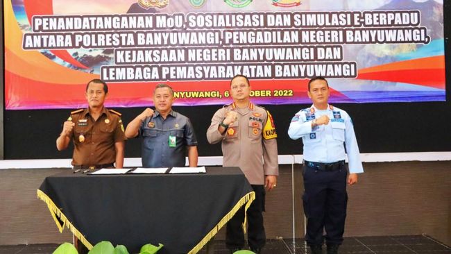 Penandatanganan MoU ini dilakukan oleh Kepala Pengadilan Negeri (PN) Banyuwangi Moehammad Pandji Santoso; Kapolresta Banyuwangi Kombes Deddy Foury Millewa; Kepala Lapas Banyuwangi, Wahyu Indarto dan Kepala Kejaksaan Negeri Banyuwangi, M Rawi di Gedung Rupatama Wira Pratama Mapolresta Banyuwangi, Kamis (6/10/2022). Kegiatan pun dilanjutkan dengan sosialisasi e-Berpadu.