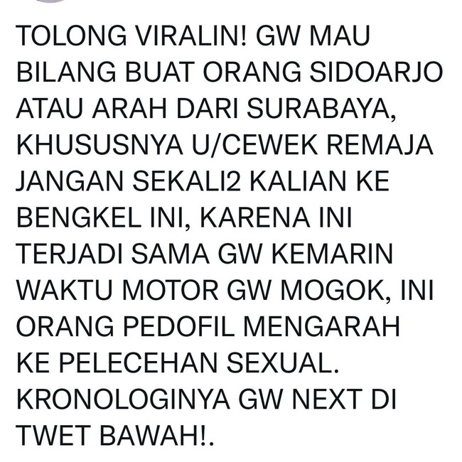 detikJatim telah mencoba menghubungi pemilik akun twitter tersebut melalui Direct Message (DM) sejak Kamis (6/10), namun pemilik akun tersebut belum merespons. Dalam utasnya, ia menceritakan kronologi saat pelecehan seksual itu terjadi. Ia juga mengingatkan pengguna jalan lain agar tidak mampir di bengkel tersebut.