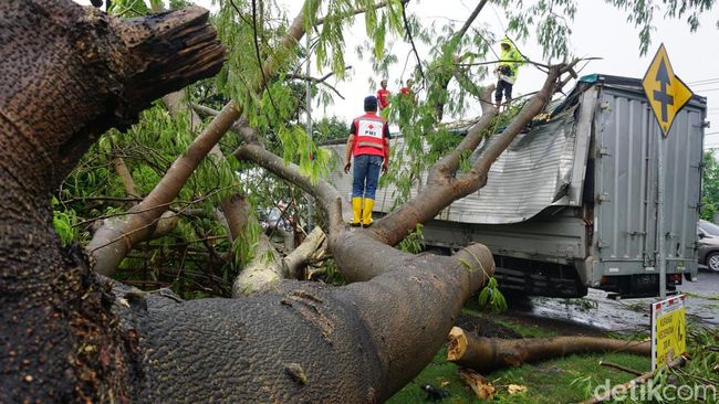 Cabang-cabang pohon menimpa bagian belakang boks hingga penyok. Sedangkan ranting-ranting pohon menjuntai ke jalan sehingga mengganggu kendaraan yang melintas dari arah Surabaya ke Jombang di jalan nasional tersebut.